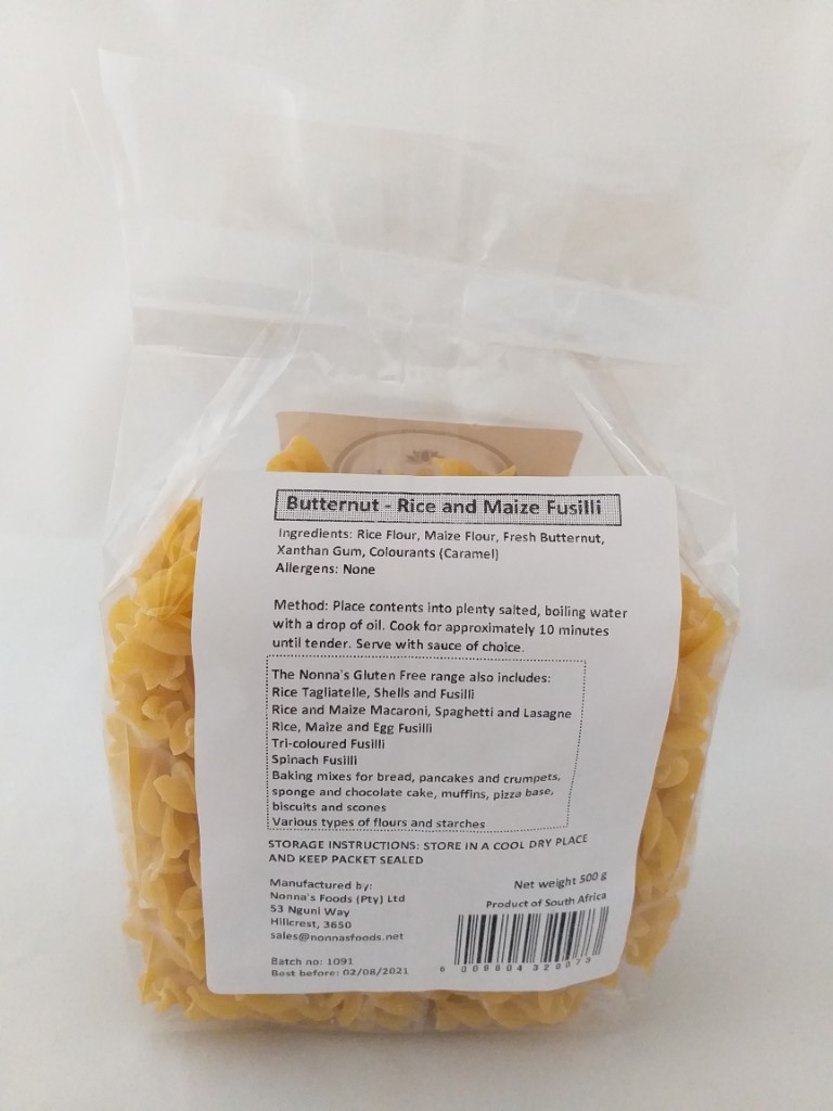 Ingredients: Rice Flour, Maize Flour, Fresh Butternut puree, Xanthan Gum, Colourant (Caramel)