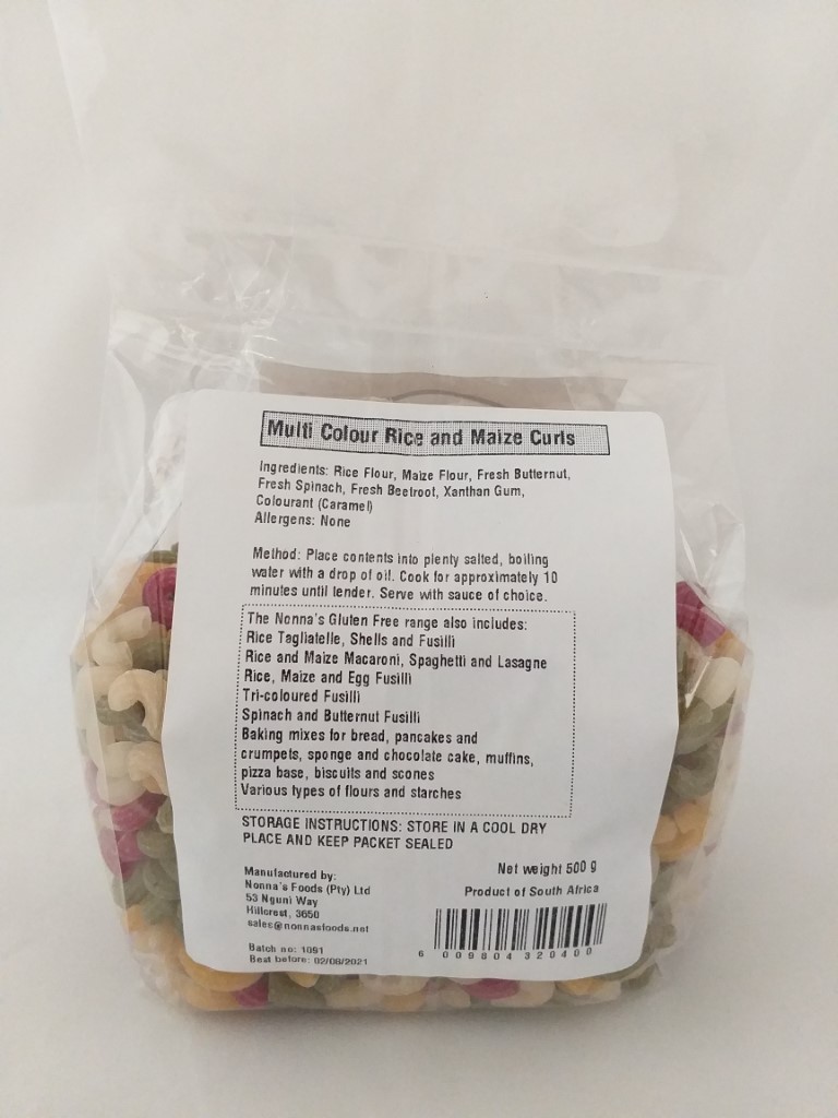 Ingredients: Rice Flour, Maize Flour, Fresh Butternut puree, Fresh Spinach puree, Fresh Beetroot Puree, Xanthan Gum, Colourants (Caramel)